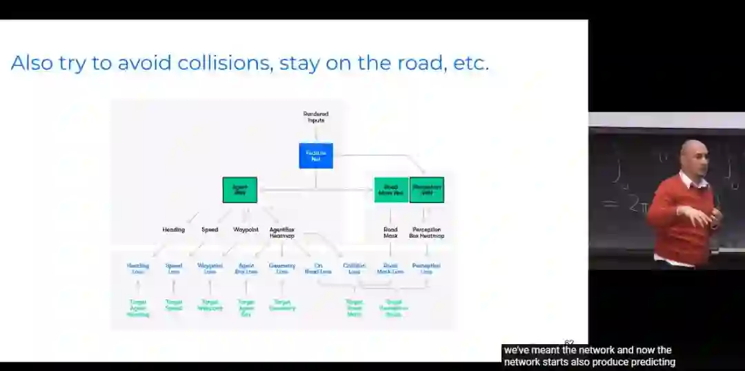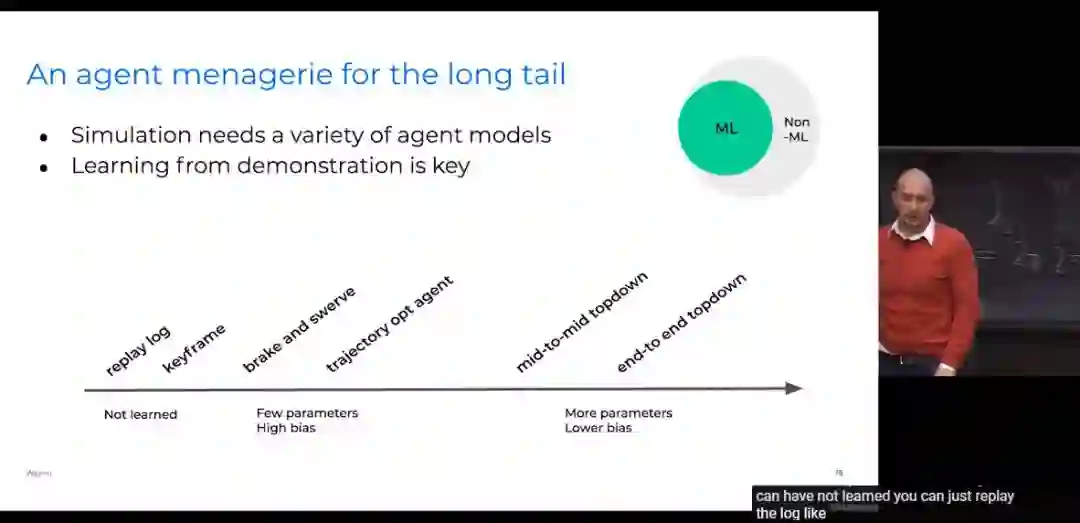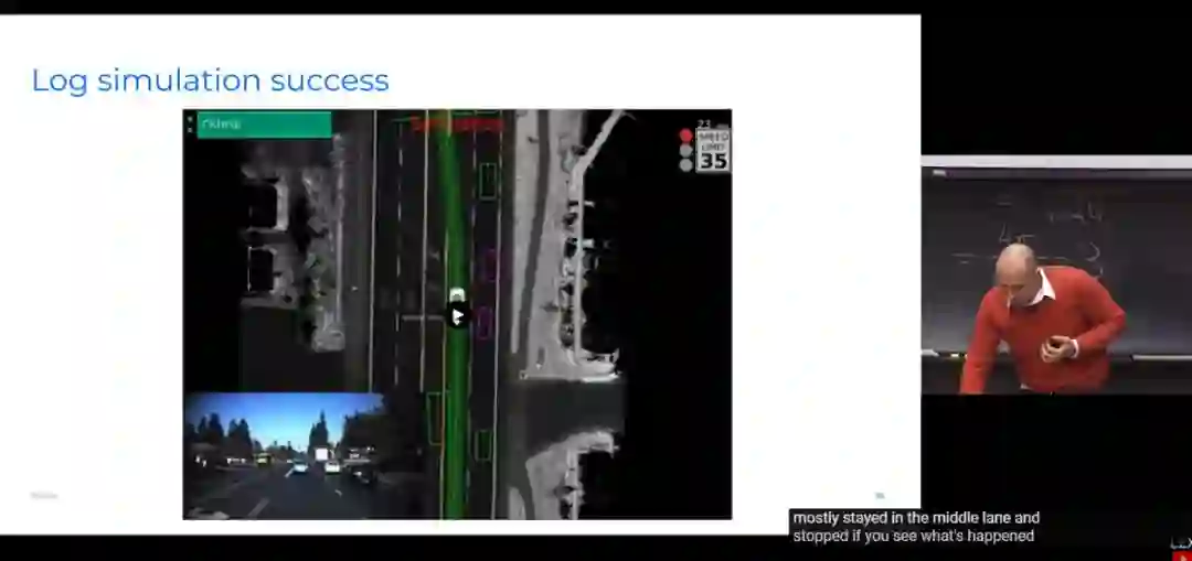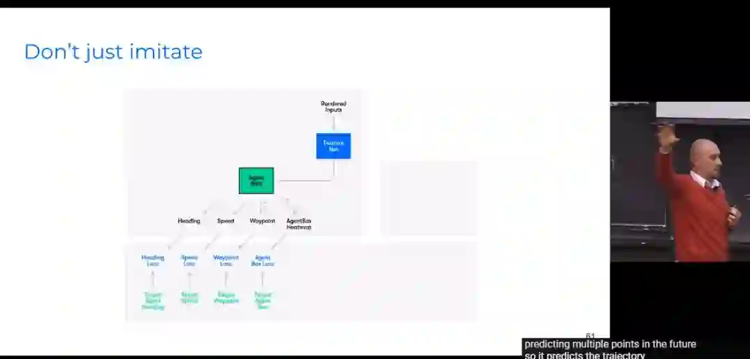 总结:Waymo 专家举出的有人带着停车标志是一个有趣例子,而且对机器学习的一个非常基本的介绍,其中提到了 AutoML 模型,可以测试多达 10K 的不同架构。然后采用前 100 个架构,在更大的模型上进行测试。Waymo 是一个混合系统,使用 ML 和混合 ML(传统的 ML 编程)。随着 ML 能力的增长,传统场景越来越少。视频中也提到了 waymo 如何测试,结构化测试,是否有封闭的测试环境。在模拟器方面,他们认为代理能够模拟现实世界中发生的事情。不断扩大复杂模型,来处理长尾问题。或者利用专家领域知识,换句话说混合模型或传统编程。以及逆强化学习,值得深入研究。