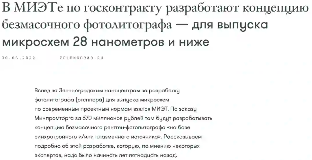 2022年3月底,俄国本地信源宣布:贸易与工业部拨款6.7亿卢布(约5100万人民币),让莫斯科国立电子技术学院(MIET)进行X射线光刻机的相关研究,以期尽早开发出基于X射线同步辐射和/或等离子电浆技术的无掩膜光刻机。
