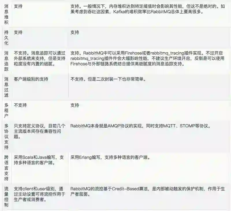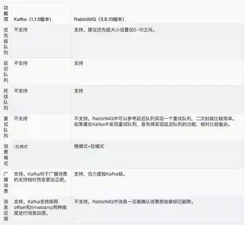 下表是对 Kafka 与 RabbitMQ 功能的总结性对比及补充说明。