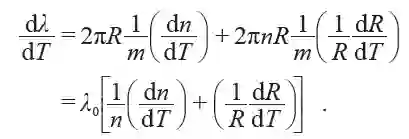 其中m为回音壁模式角模式数,dn/dT和(1/R)(dR/dT)分别为腔体材料的热折变系数和热膨胀系数。因此提高腔体材料的热折变系数和热膨胀系数,即可提高温度灵敏度。另外,提高微腔的品质因子同样也可以提高对温度的分辨率。