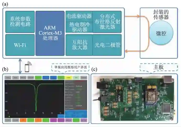 图8 无线回音壁微腔温度传感器[7] (a)无线回音壁微腔温度传感系统示意图。探测光从DBR激光器中传输到封装的回音壁微腔中,光电探测器接收经过微腔的传输谱,然后经过信号放大单元与光电处理单元。传感系统可以通过Wi-Fi 单元利用智能手机控制和读出分析;(b)传感器的苹果iOS 手机控制软件;(c)传感系统主板图