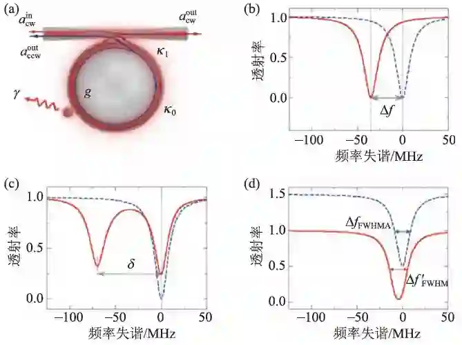 在模式分裂传感机制中要求模式分裂大于模式线宽。但其实即使颗粒散射引起的模式分裂小于线宽,传输谱上也可以观察到模式线宽增加(图4(d))。模式展宽机制可以适用于模式分裂不可分辨的情况,主要以颗粒散射导致的模式线宽变化作为检测信号,这个线宽变化程度取决于正反行波模式之间的耦合强度和纳米颗粒侧向散射导致的腔模损耗。由于环境热噪声或者激光频率噪声等只会影响回音壁模式谐振频率,而不会影响模式线宽,因此模式展宽机制对这些噪声具有天然的免疫能力。同时,其不要求模式分裂大于线宽,因此模式展宽机制比无源模式分裂机制一般具有更低的检测极限[28]。