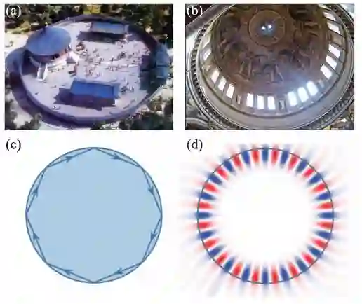 “耳语回廊”模式(whispering-gallery mode,WGM)最早发现于声学体系中。在北京天坛和英国伦敦的圣保罗大教堂(图1(a,b))都有一个结构类似的环形“耳语回廊”。它们有一个共同特征:当两个人贴近墙内壁站立,若一个人在一端对着回廊窃窃私语,即便他们相隔很远,走廊另一端的人也可以清楚地听到,犹如耳边低语,“耳语回廊”以此得名。早在19 世纪,著名科学家Rayleigh 爵士就首次分析了其中的声学原理给出了物理解释。他认为:这是由于声波沿着回廊光滑的墙内壁连续反射来进行传播,传播损耗很小。这种声波模式也因此被命名为“耳语回廊模式”,而在中国我们习惯性叫作“回音壁模式”。由于电磁波在从光密介质向光疏介质传播时会发生全反射现象,因此在如图1(c,d)具有旋转对称的几何结构中,当光线沿着几何结构边界内壁传播时会发生连续的全反射,光束被约束在环形边界上,从而产生类似的回音壁现象。若光束绕几何结构边界行走一圈的光程满足波长的整数倍时,会产生干涉加强现象即共振现象,其中用来约束光场的环形结构即被称为回音壁模式光学微腔。
