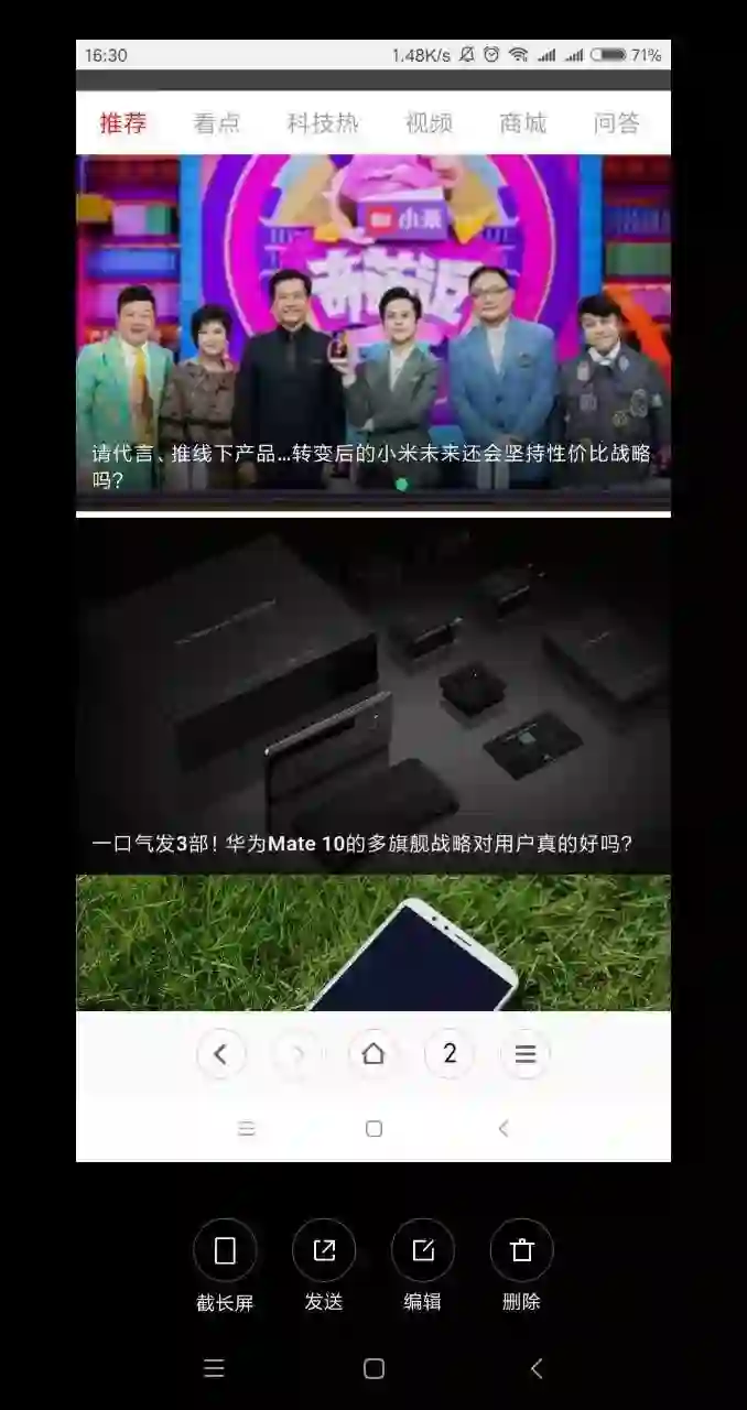 EMUI 的截图方式为音量键加电源键,还可以设置为手指关节叩击屏幕,也支持长截图功能。另外,EMUI 自带的浏览器还可以实现自定义区域截图,这点还是要比 MIUI 9 方便的。
