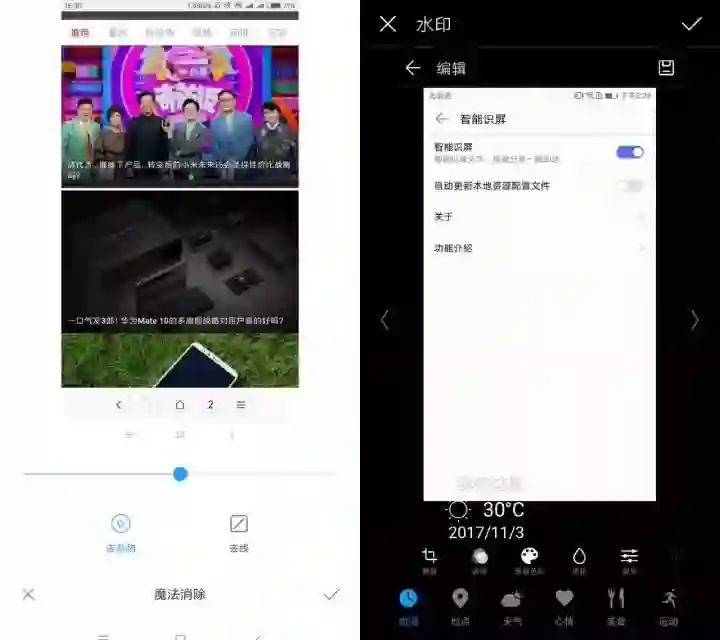 在图片编辑方面,MIUI 9 和 EMUI 8.0 都提供了丰富的选项,不过不太一样。MIUI 9 自带的图片编辑工具可以进行裁切、加滤镜、马赛克等,比较有特点的功能为魔法消除,可以清除图片上的线条或点状物体。EMUI 8.0 的特色功能为水印添加、标注等。