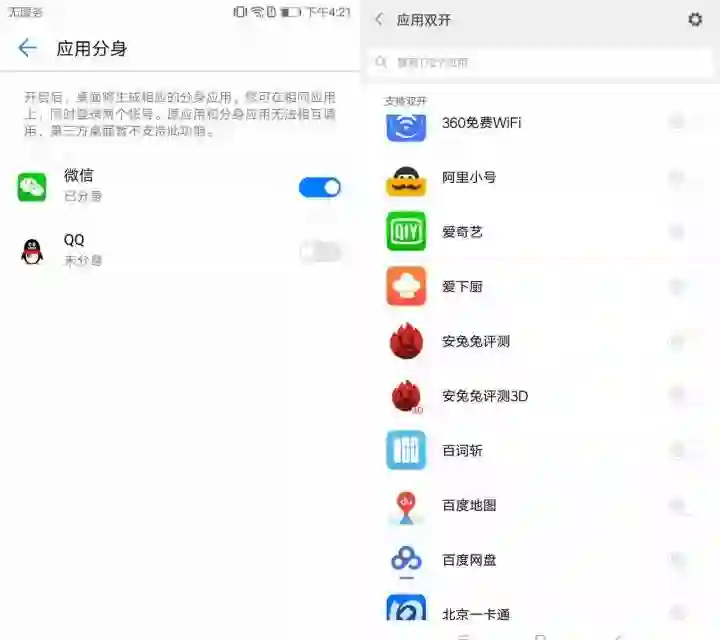 EMUI 8.0 上将这种功能成为应用分身,但只支持微信和 QQ 两个应用,MIUI 9 则几乎支持所有应用。