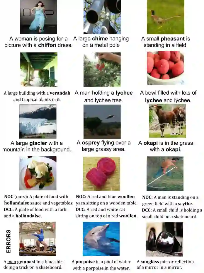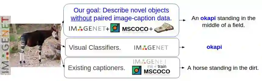 当前的视觉描述或图像字幕生成模型效果已经很好,但是它们只能描述现有的图像字幕训练数据集中出现过的物体,且需要大量训练样本来生成好的描述。要学习如何在语境中描述类似「豺」或「食蚁兽」的物体,大多数视觉描述模型需要大量带有对应描述的豺或食蚁兽样本。但是,当前的视觉描述数据集,如 MSCOCO,不包含对所有物体的描述。与之相反的是,近期使用卷积神经网络(CNN)的目标识别工作能够识别出数百种类别的物体。尽管目标识别模型能够识别豺和食蚁兽,但是描述模型不能生成这些识别动物在语境中的准确描述语句。我们构建的视觉描述系统克服了这一难题,该系统无需成对的新物体图像和语句数据就可描述该物体。