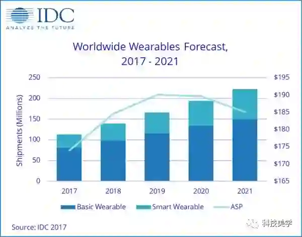 根据IDC的数据,2017年前三季度全球智能穿戴设备出货量为7730万台。因此预计2017年全年将出货1.16亿台。而到2021年,全球可穿戴设备的出货量将达到2.523亿台。在智能穿戴设备数据增长放缓的情况下,IDC仍然给出如此乐观的预测,在不可安装第三方程序的智能穿戴产品销量下降的背景下,显然是对以Apple Watch为代表的智能手表市场的看好。