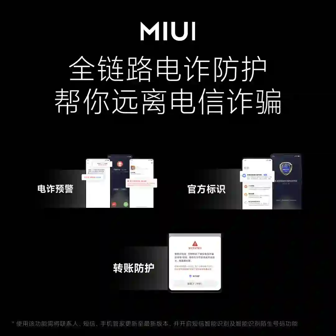 针对近来频频发生的电信诈骗,MIUI 13 推出了全链路防功能,包括电诈预警、官方机构标识、转账防护三重防护,对诈骗短信及电话提供系统级预警,为官方机构予以醒目标识,还可以通过警示,提醒用户不要下载诈骗应用或转账给疑似诈骗者。