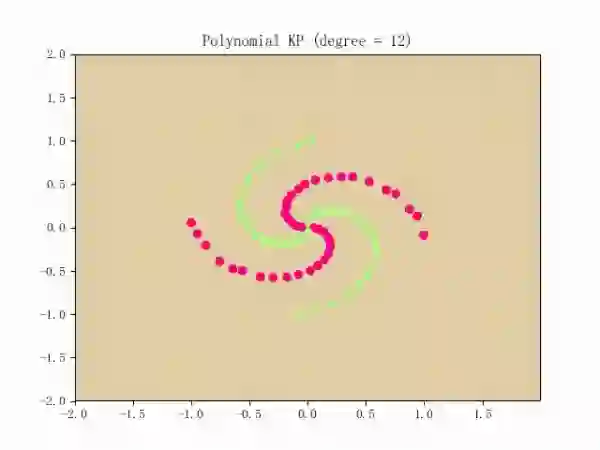 当我们对感知机应用核方法后,它就能对非线性数据集(比如螺旋线数据集)进行分类了,训练过程将如下: