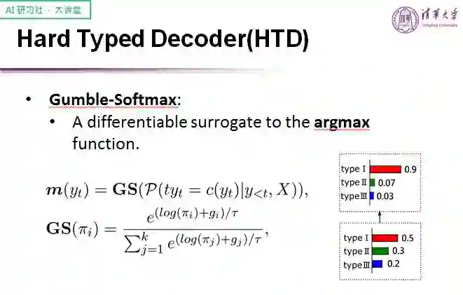 在强类型解码器中,只存在一个词表,词表被分为 3 个部分,每个部分对应不同的类型。我们先预测某个类型上的概率分布,再利用 gumbel-softmax 做锐化,使其起到类似 gate 的作用,最后利用 gate 去调适整个词表上的概率。