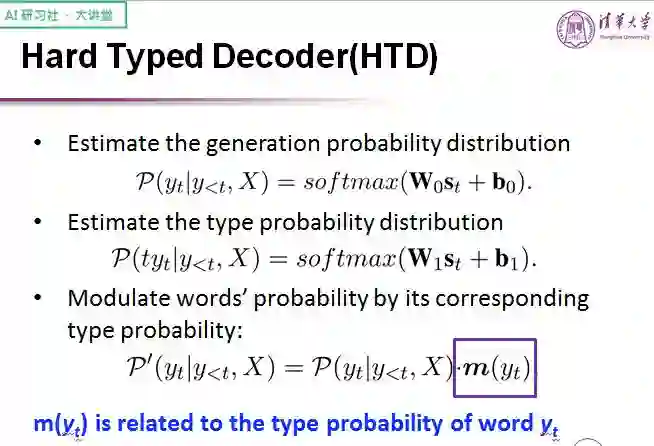 我们首先看弱类型化解码器 STD,对于当前的解码状态,我们会通过一个信息层估计每一种词(疑问词/话题词/普通词)并据此生成概率分布。我们假设每一个词都有能力充当某种类型的词,所以会维护三个内容相同的类型词表。每一种类型的解码会先预测这个词表中每个词出现的概率,再对当前解码位所需要的词语类型概率进行一个预测,最后将二者结合起来得到最终的词表概率分布,取其合纵最大的一个作为生成词。在同一个词表中使用不同的分布,每个分布都会有对应的类型,于是我们使用一个混合策略,将这些概率分布混合起来。