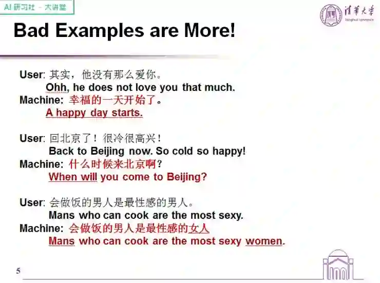 这是利用深度学习模型所训练出的一些比较好的结果。可以看出,机器学习生成方式具有一个很好的优点,就是具有一定的创新性的,不再局限于训练数据中的结果,而是基于生成模型来生成回复,因此回复往往富有创造力。