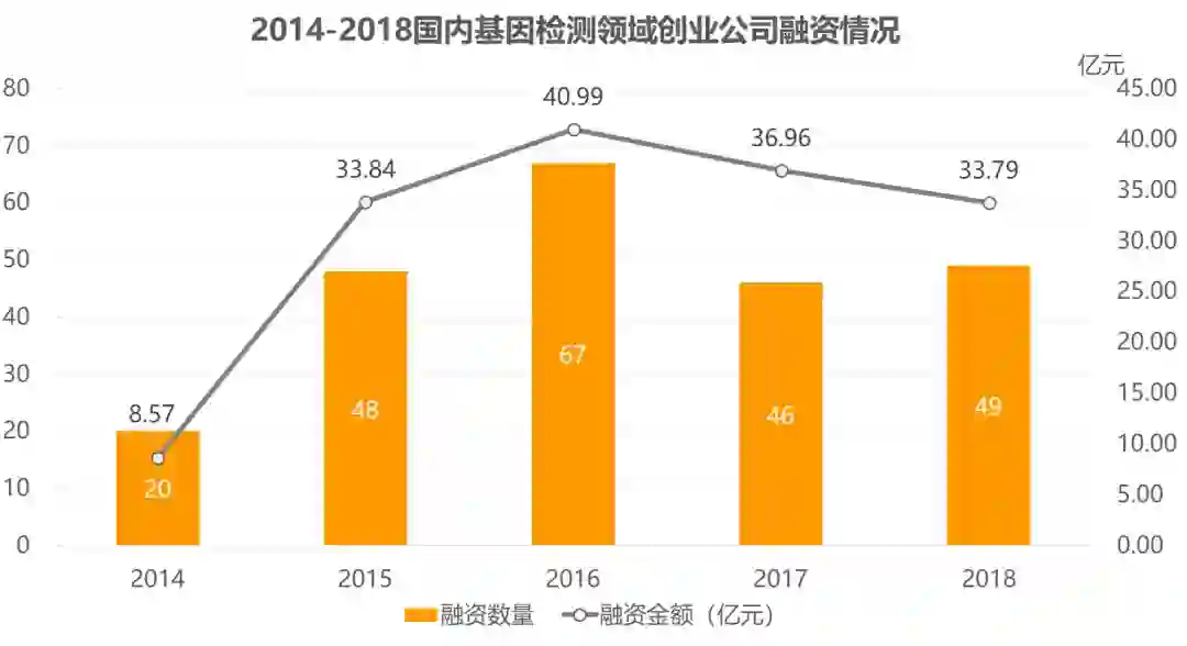 随之,基因检测逐渐成为我国创投领域热门风口。通过 IT 桔子观察 2014 年到 2018 年五年数据可以看到,自 2014 年以来我国基因检测行业融资热度逐渐攀升,在 2016 年达到顶峰。