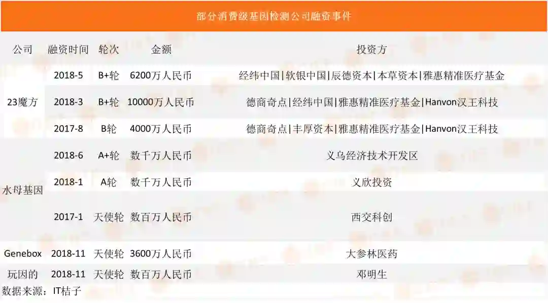 所以可以看到,近两年能获得资本投资的消费级基因检测公司大部分都能够提供医疗或科研级基因检测服务,即使是目前纯粹的消费级基因检测公司其创始团队的技术背景一般都很雄厚,未来这些公司也一定有能力提供更多维度的服务。