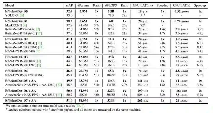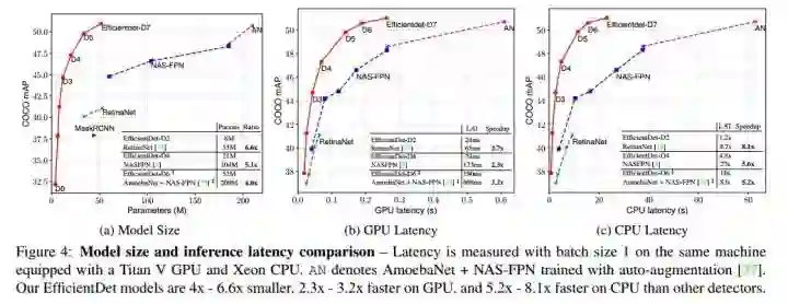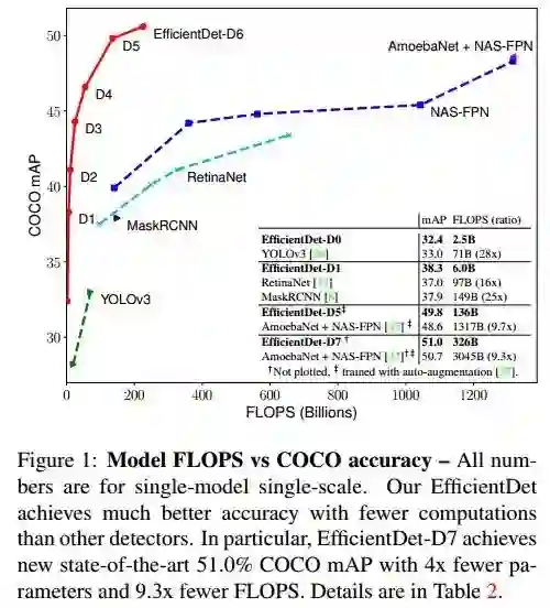 例如:Compared to RetinaNet and Mask-RCNN, EfficientDet-D1 achieves similar accuracy with up to 8x fewer parameters and 25x fewer FLOPS.