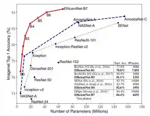 例如:EfficientNet-B3达到了比ResNeXt-101还高的精度,同时参数量比后者小18倍。