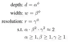 指明有多少资源可用,而α,β,γ指定如何分配这些资源给网络宽度,深度和分辨率。网络深度增加一倍,FLOPS变为之前的两倍;网络宽度和分辨率增加一倍,FLOPS变为之前的四倍,所以上述操作将使得FLOPS变为之前的