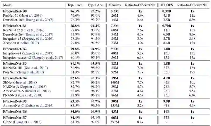 例如:66M parameters,37B FLOPS 的 EfficientNet-B7 达到了84.4% top1 / 97.1% top-5 accuracy,比之前最高精度的GPipe还高,而且比GPipe的参数量小8.4倍。