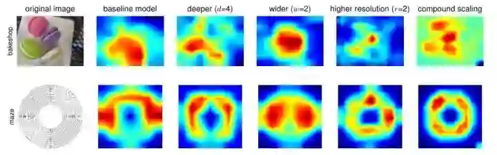 可视化来定性对比下,绘出模型的Class Activation Map (CAM),可以看到,EfficientNet确实可以专注于具有更多对象细节、更相关的图像区域。
