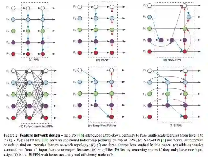 如上图所示,FPN引入了一条自顶向下的通道来融合特征;PANet在FPN基础上增加了一条自底向上的通道;NAS-FPN使用了搜索出来的不规则的拓扑结构。(d)-(f) 是作者所探讨的三种FPN结构的候选。(d)是全连接的FPN;(e)是PANet的一种简化版,去除掉只有一条输入边的结点;(f)是作者最终使用的BiFPN,在(e)的基础上,若输入和输出结点是同一level的,则添加一条额外的边,在不增加cost的同时融合更多的特征。(注意,PANet只有一条top-down path和一条bottom-up path,而本文作者是将BiFPN当作一个feature network layer来用的,重复堆叠它们来获得更高级的特征融合方式)