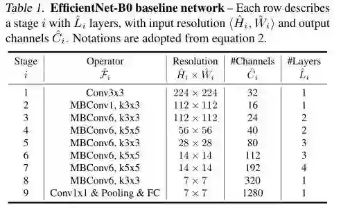 作者以MobileNet v2中的MBConv + squeeze-and-excitation optimization作为基本构建模块,利用论文《MnasNet: Platform-aware neural architecture search for mobile》中提出的NAS方法(此处将 作为优化目标),搜索到一个efficient network,作者为其取名 EfficientNet-B0,并将它作为后续的baseline network。