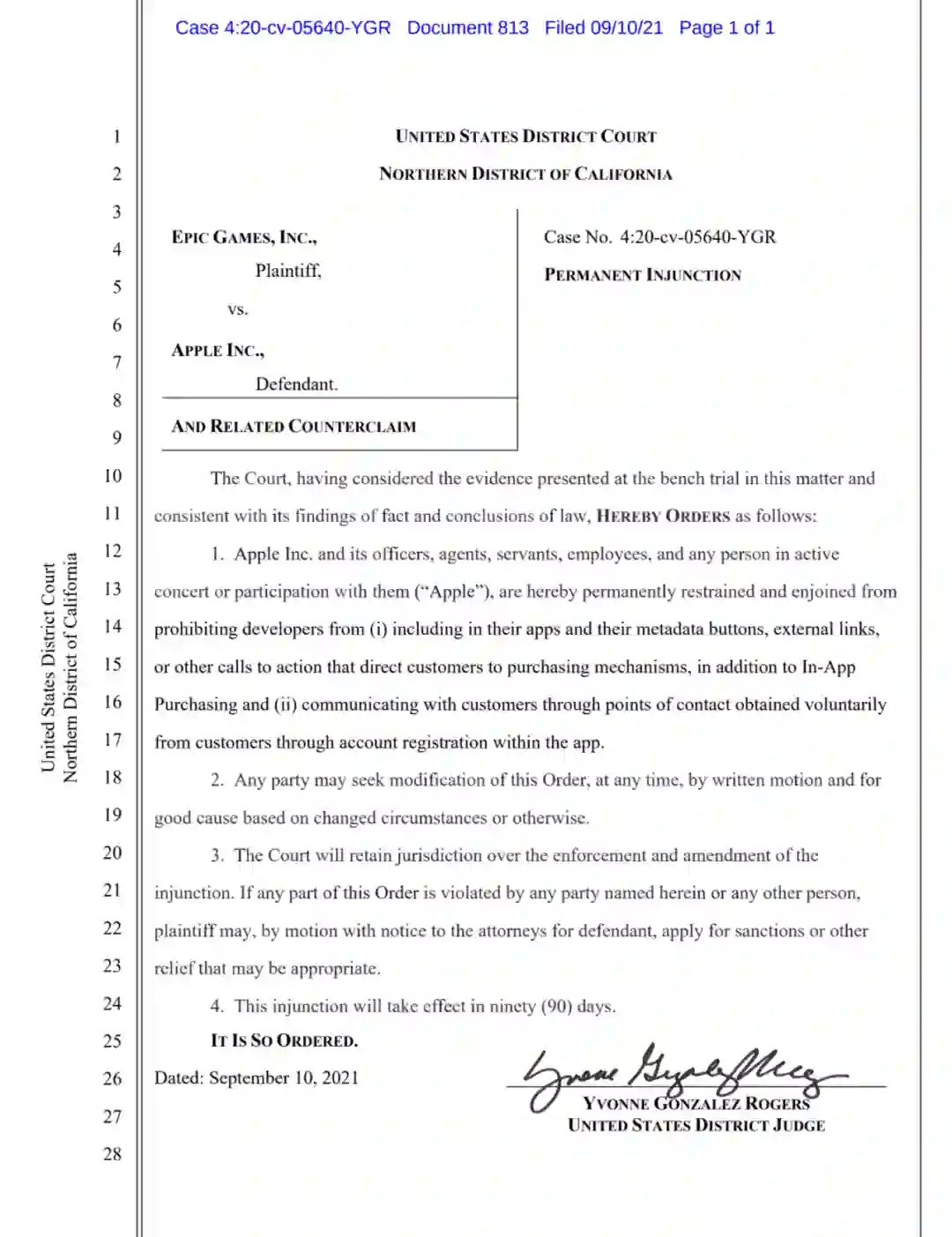 9 月 10 日,美国加州地方法官 Judge Yvonne Gonzalez Rogers 签署了一项有关「Epic v. Apple」的永久禁令,宣告了这场诉讼战争告一段落。