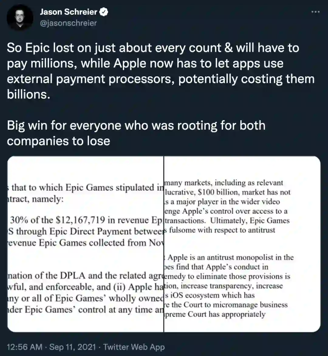 这样的结果对 Epic 来说仍然不够完美,公司 CEO Tim Sweeney 在推特上表示:「今天的判决对开发商或消费者来说都不算是胜利。」