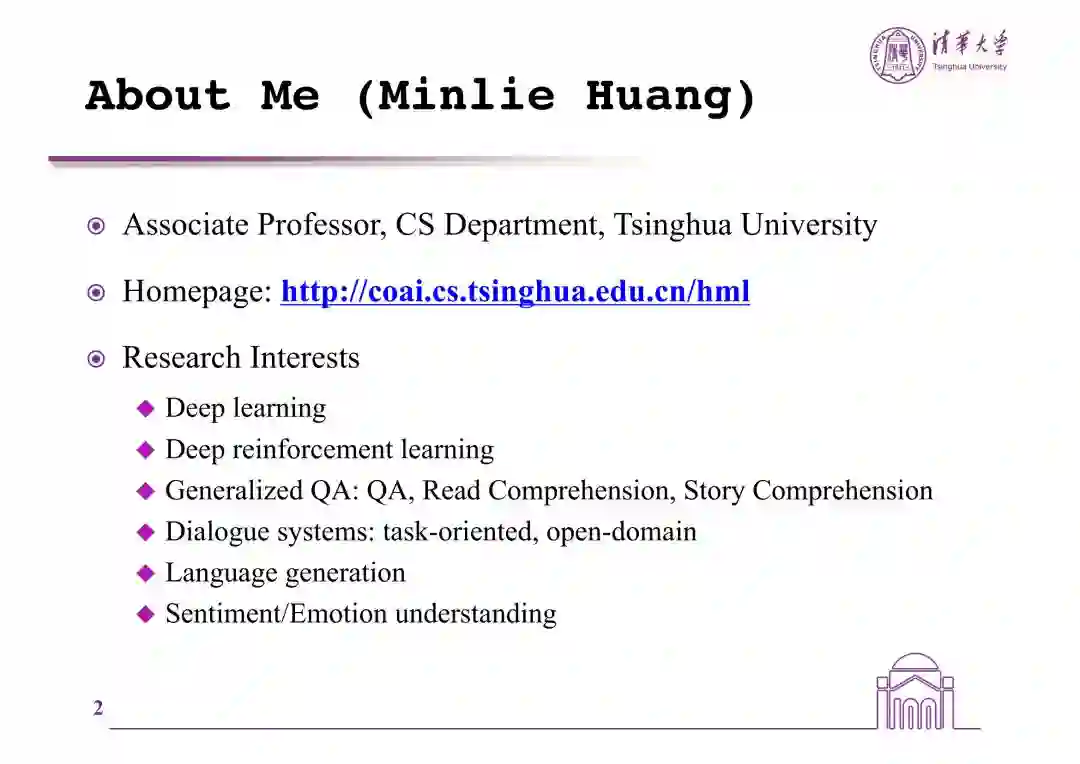 清华大学计算机系副教授,博士生导师。研究兴趣主要集中在人工智能、深度学习、强化学习,自然语言处理如自动问答、人机对话系统、情感与情绪智能等。