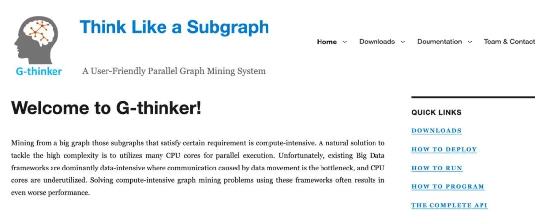 从 2020 年开始笔者的研究团队开始根据 T-thinker 框架开发了一系列大数据挖掘系统,均发表在数据库最顶级的会议及期刊上。第一个系统是 G-thinker,用于解决从大图上寻找满足用户定义的条件的子图实例的问题,比如数三角形,找高密度子图(比如对应社交团体)以及子图匹配。G-thinker 可以通过 https://bit.ly/gthinker 访问(见图 4),其开发获得美国科学基金(NSF),南部大数据中枢(South BD Hub)以及微软的 Azure 云平台的资助。发表的相关论文顶会顶刊云集,包括:
