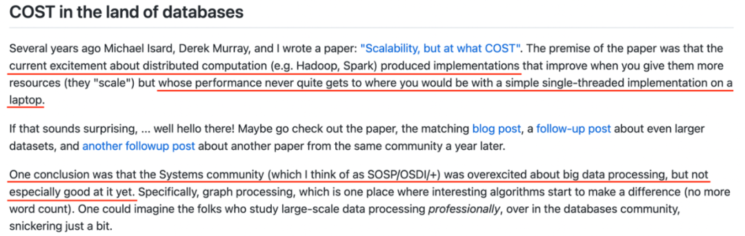 图 1:Frank McSherry 部落格 “COST in the Land of Databases” 对大数据系统的相关评论。