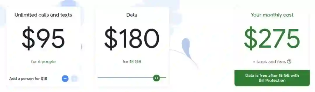 值得一提的是如果是多个用户以家庭为单位(最高支持 6 人)开启 Google Fi,费用相对会比较优惠,当开通人数为 6 人时,基础费用共计为 95 美元/月,数据用量上限则能提升至 18GB(即 18GB 后便不再计算数据费用)。