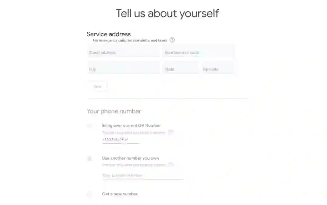 选择好资费套餐后(其实就一种,根本没得选)就要填写服务地址并选择手机号码了,需要注意的是,服务地址的不同会导致 Fi 每月通讯账单中的税费不同,可以选择税费较低的州;手机号码的选择就比较多了:既可以直接沿用谷歌账号已有的 GV 号,也能将手上美帝的电话号码进行携号转网,或者重新申请一个新的号码。然后下一步绑定支付使用的信用卡即可(已经在账号中绑定过的可以直接使用)。