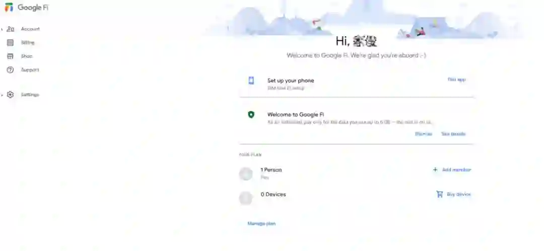 申请完后就能看到管理页面了,目前页面上没有对应的机器,可以看到 Welcome to Google Fi 以及提醒去设置手机进行激活。
