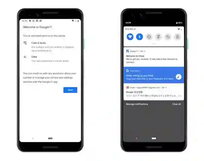 注册完成后我们就可以换用 Pixel 3 激活了。首先我们需要前往 Play 商店下载 Google Fi 这个 App(提醒一下,仅在美区上架),连上 Wi-Fi 并按照指示选择好谷歌账号,然后不停下一步、下一步就行了——最后看到通知栏出现 Welcome to China,就表示成功激活了。