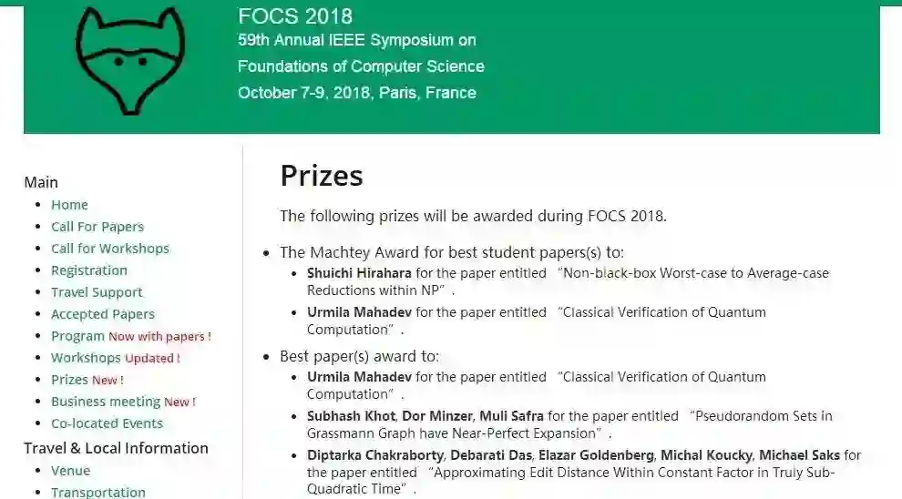 在今年于巴黎举行的理论计算机科学领域的最顶级会议——计算机科学年度基础论坛(FOCS)上,一位来自加州大学伯克利分校的博士后“一战成名”:乌尔米拉·马哈德(Urmila Mahadev)的成果被会议授予“最佳论文”和“最佳学生论文”奖。这是理论计算机科学家梦寐以求的殊荣。