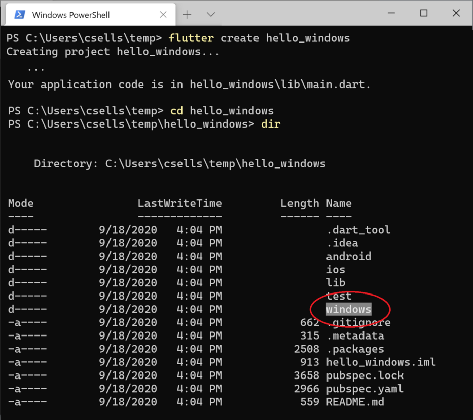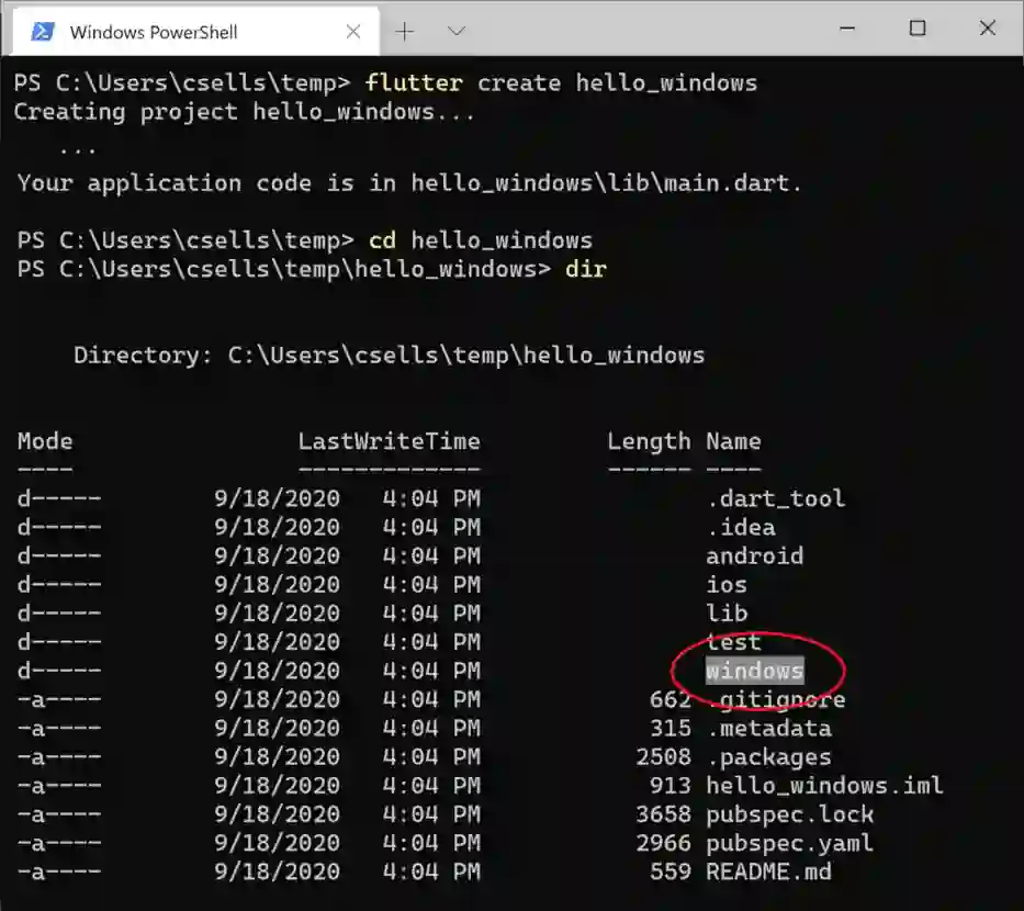 完成这些设置后,每次您通过 Android Studio 或 Visual Studio Code 扩展程序,或者通过命令行创建新的 Flutter 应用时,都会创建一个 Windows 子文件夹。