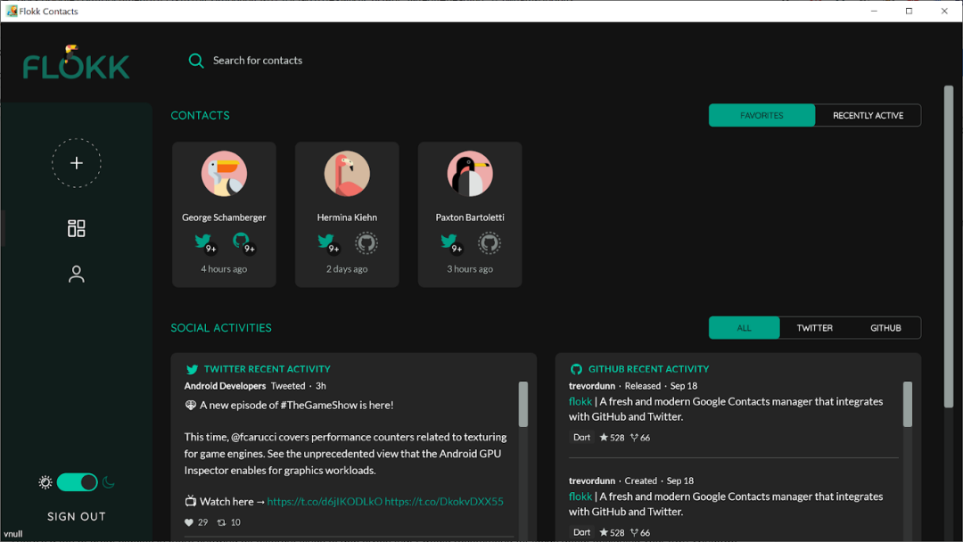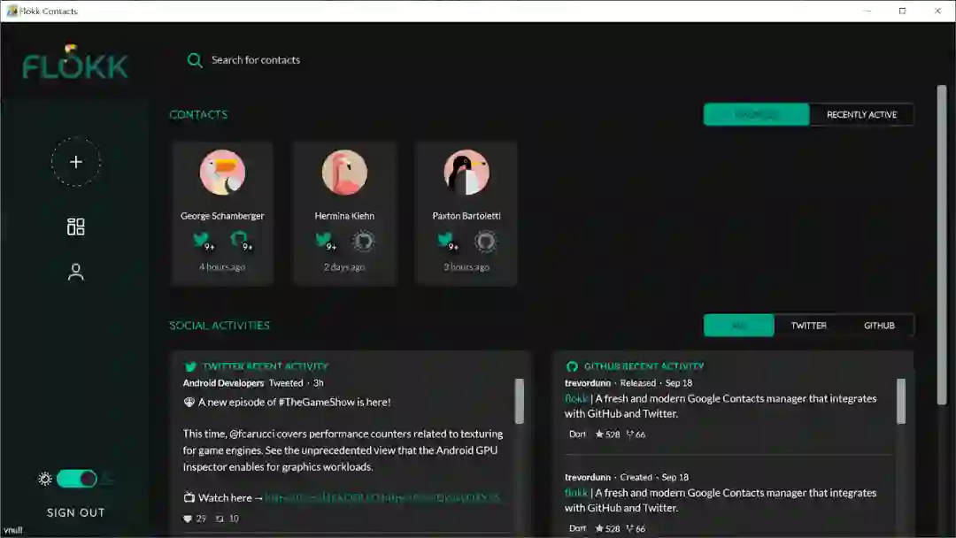 要实际了解 Flutter 对 Windows 的支持,可以查看我们创建的一些示例应用,这些应用通过我们新增的支持,在 Windows 上运行良好。第一个示例是 Flokk 应用,它是我们与 gskinner.com 的设计师和开发者合作的成果。我们旨在通过创建一个富有创意且美观的 Flutter 桌面应用,表明 Flutter 已经为桌面做好准备。Flokk 这款应用可以使用您的真实 Google Contacts 数据,并显示您的联系人在 GitHub 和 Twitter 上的活动。