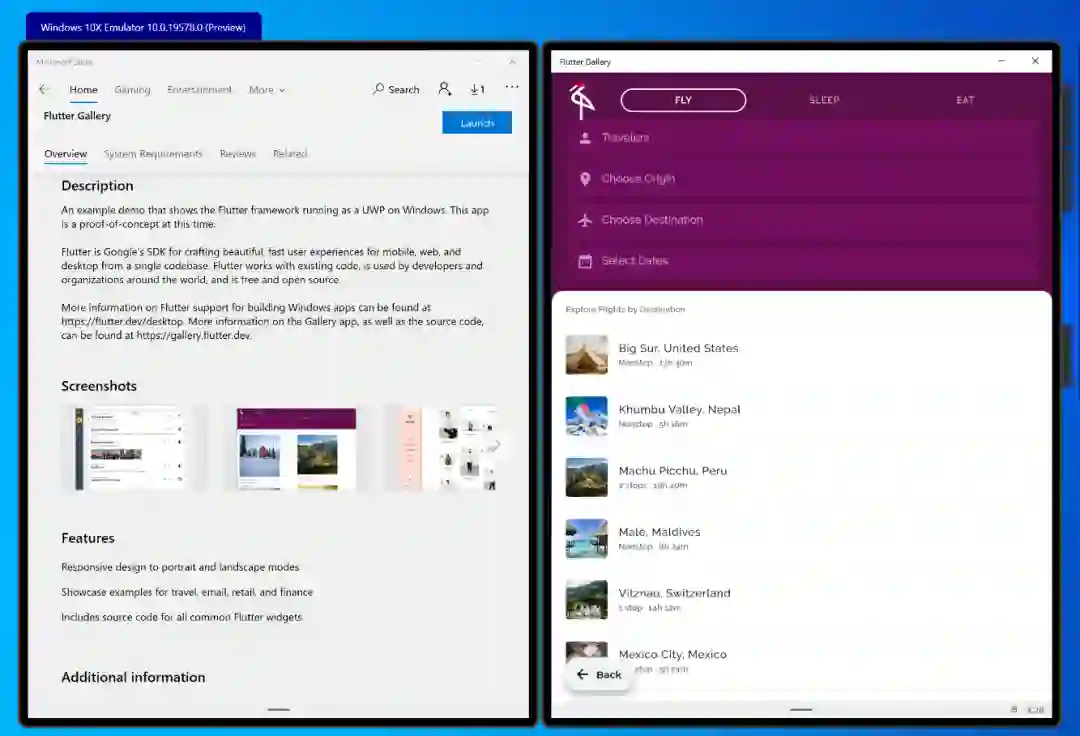 除了支持经典的 Win32 API 外,我们还在试验基于 UWP 的 Flutter 容器应用,该版本可以让 Flutter 登陆更多 Windows 设备,包括 Xbox。作为该试验的一部分,本周我们在 Windows Store 上发布了一个基于 UWP 的 Flutter Gallery。