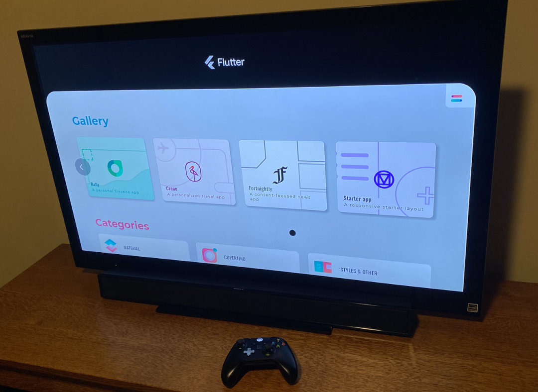 以下屏幕截图显示了在 Xbox 上运行的基于 UWP 的 Flutter Gallery:
