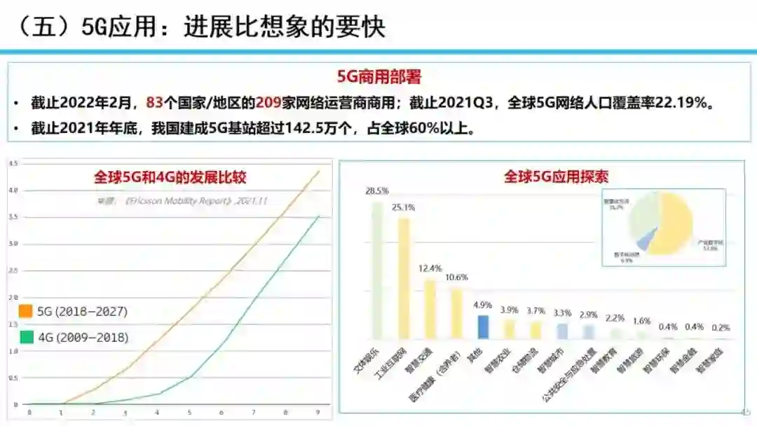 另外也提一下5G。5G在中国发展很快,但大众认知的5G和真正的5G发展其实有反差,比如在中国可能很多人都会觉得5G发展没有那么好,但实际上,5G其实比4G发展要快很多。中国进入4G是2013年,而全球4G启动2009年,我们大概晚了4年才启动,在此之前所有要素都相对完善了,所以进去就是高峰。而5G中国第一时间和美国、韩国三个国家同步部署,所以我们是引领者、引导者,意味着自己要做很多试错。下图有一些典型的全球5G应用探索,可以看到绝大部分应用都是to B的,都是广义工业互联网范畴,这一点和过去4G技术有很大不同。