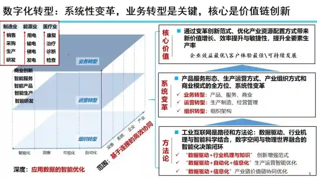 ,过去可能没有过多强调,但现阶段比较重要。一个是连接范围,通过网络连接从生产系统到企业、到产业价值链,连接范围多大,也意味着数字化转型所涉及范围有多大。而不同的行业、不同的企业,有不同取舍或不同的切入点。另一个是深度,数据智能和企业核心业务、生产、经营管理结合得有多深,也会决定价值的高低。数字化转型是一个系统性变革,从业务转型驱动整个运营体系的转型,及组织变革,是一个全面过程,而业务转型是关键,。在这个过程中,通过连接和数据的深度应用,会形成一个新的优化范式。所以,现在讲数字化转型和过去20年、30年的信息化自动化还是有些不同,引入了一些新的特质、新的要素。