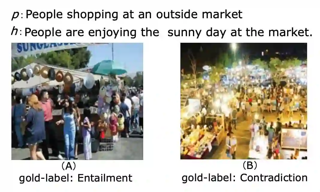 如果单纯看两个句子,我们可能会因为 outside market 而推理出天气是 sunny day,但实际上这也不是能够十分明确的。而加入了情境信息的话,情况就会有所不同,例如图 A,那么两个句子之间的语义关系就是 Entailment,但换成图 B 的时候,因为时间变成了晚上,那么两个句子之间的语义关系就成了 Contradiction。