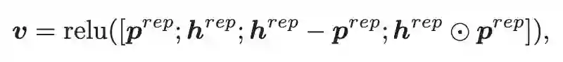 这里,直接拼接可以保留所有的信息,相减操作可以指明推断方向,同时是一种最朴素的差异判断方法,而点乘可以认为是一种最简单的相似度计算方法,通过这样的操作,就可以得到两个句子之间推理关系的一个向量表示。