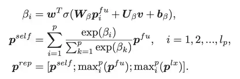 这里作者使用了 self-attention 机制,并同时使用了最大池化操作(max-pooling),这样对句子语义表示重要的信息会被选 择出来,同时对语义表示最重要的信息也会被选择出来进行重点突出,通过这种方式,就可以得到句子语义全面的一个表示: