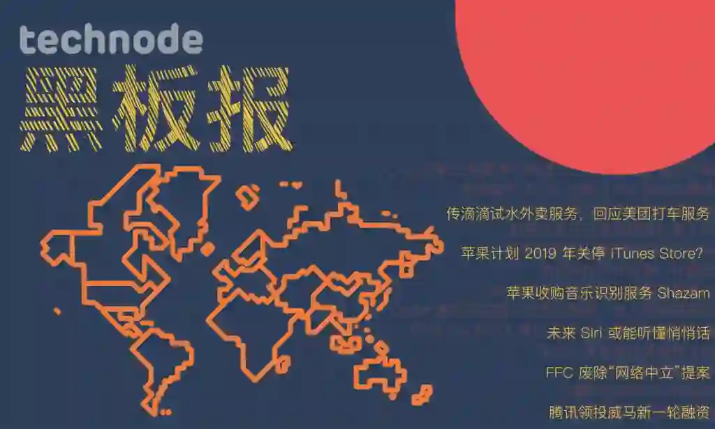 这一周我们看到可能是由于美团此前尝试推出打车服务,所以有消息称滴滴试水外卖业务 ; 传苹果计划 2019 年关闭 iTunes Store,专注于 Apple Music; 苹果收购音乐识别服务 Shazam; FCC 投票废除“网络中立”提案...