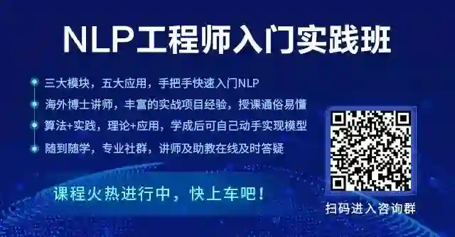 三大模块,五大应用,手把手快速入门NLP;海外博士讲师,丰富项目经验;算法+实践,搭配典型行业应用;随到随学,专业社群,讲师在线答疑。详情点戳阅读原文链接或长按识别上方二维码~