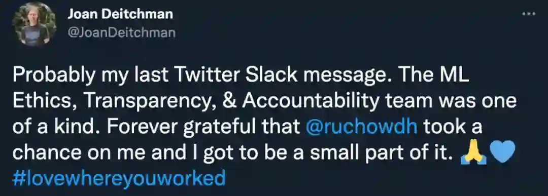 不久前,推特前高级工程经理 Joan Deitchman 透露,她所在算法团队已经被解散。