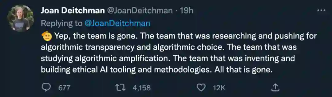 「是的,队伍没了。研究和推动算法透明度和算法选择的团队。研究算法放大的团队。发明和构建符合道德的 AI 工具和方法的团队。一切都过去了。」