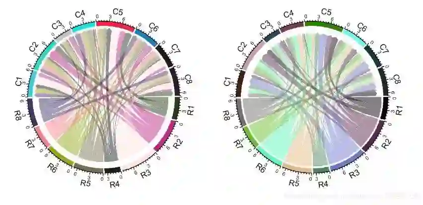chordDiagram(mat, grid.col = grid_col, transparency = 0, link.rank = )# 设置透明度为0,方便观察